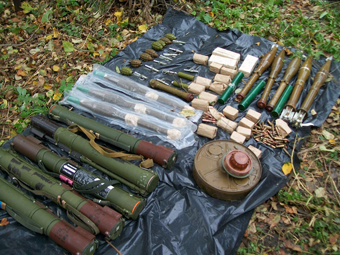В общем изъято пять ручных гранатометов, семьдесят гранат, семь мин, четырнадцать выстрелов к гранатометам, два самодельных взрывных устройства, почти одну тысячу патронов различного калибра.