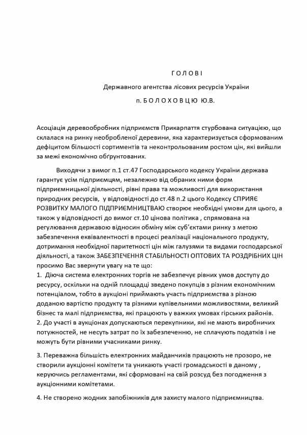 “Аукціон – це лотерея, сьогодні виграв, а завтра ні. Ми бачимо, що на них є домовленості, коли ціни зростають у три рази. Хто собі може це дозволити купити? Ми хочемо нагадати владі, що ми є. На Прикарпатті реально діють 900 деревообробних підприємства, а поруч з ними працюють підприємтсва, які постачають обладнання та здійснюють транспортування”, – наголошує чоловік.