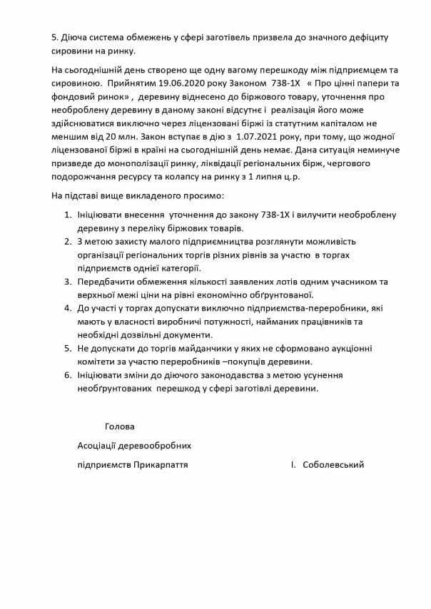 Голова асоціації Ігор Соболевський розповідає, що деревообробна діяльність Прикарпаття стала на межу ліквідації, бо вона “загнана” на аукціонні торги. Він додає – якщо вони сьогодні не будуть працювати, то ОТГ залишаться без бюджетів, що призведе до знищення структури децентралізації.