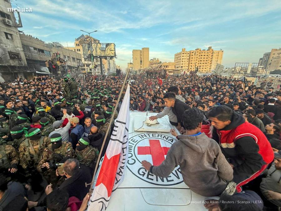 Известный оппозиционный российский режиссер и продюсер Александр Роднянский, используя фото, на котором запечатлен факт передачи боевиками "Хамаса" трех израильских девушек 19 января, обращает внимание на устрашающий вид тех, кто участвует в акции - их лица закрыты черными балаклавами, а поведение иначе не назовешь, как "звериное".