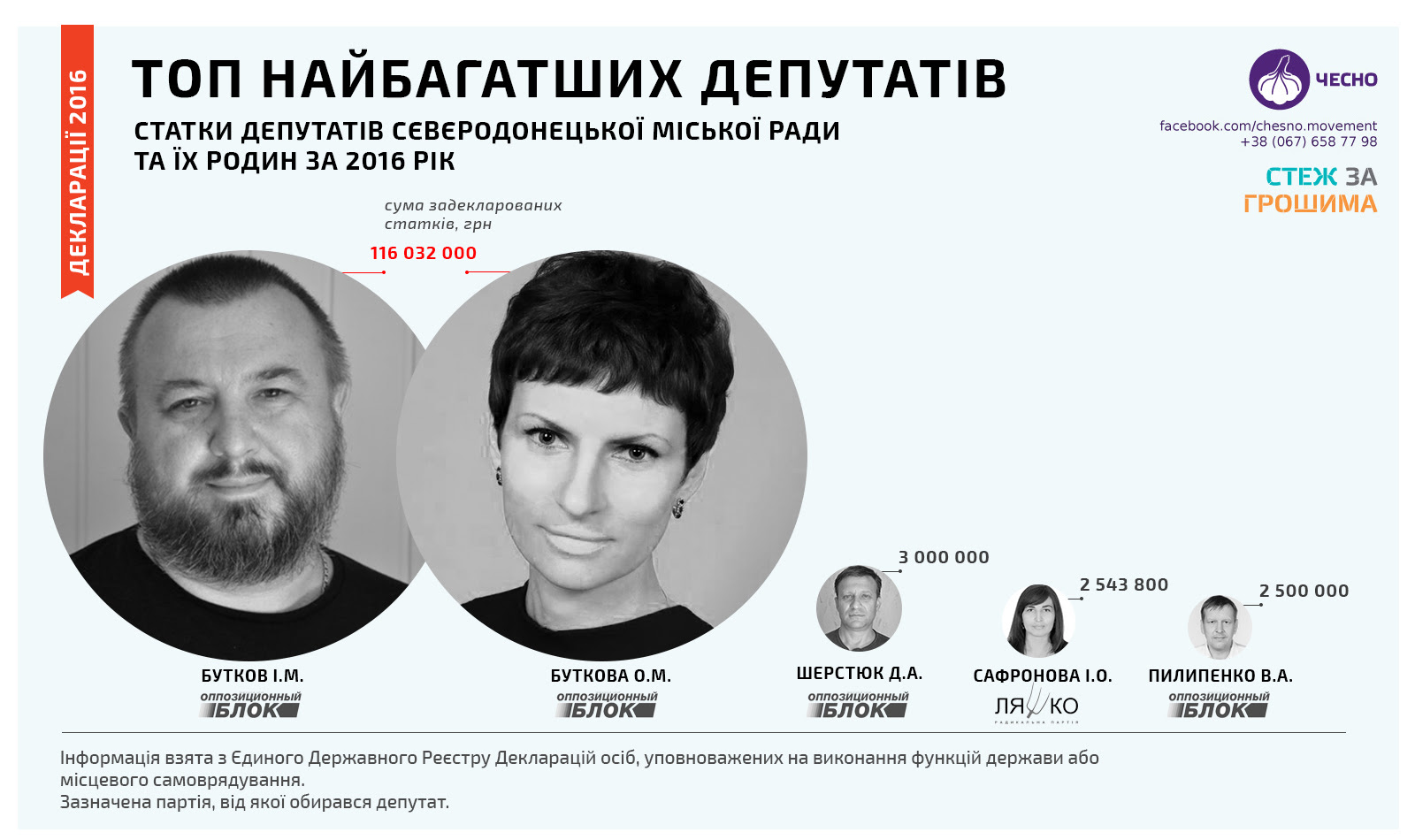 Активісти з"ясували: "Кожен сьомий депутат живе за межею бідності. Секретар міськради Бутков декларує мільйони готівки у валюті. Його безробітний бізнес-партнер Пилипенко не показує своє підприємство з кримінальним минулим. Майже всі статки сконцентровані в представників “Опоблоку”. Деякі “опоблоківці” приховують свої фірми. Злиденна Щербатюк зізнається — заробляє як може і “зірок з неба” не хапає. Найбільші доходи за рік - у депутатів-підприємців.