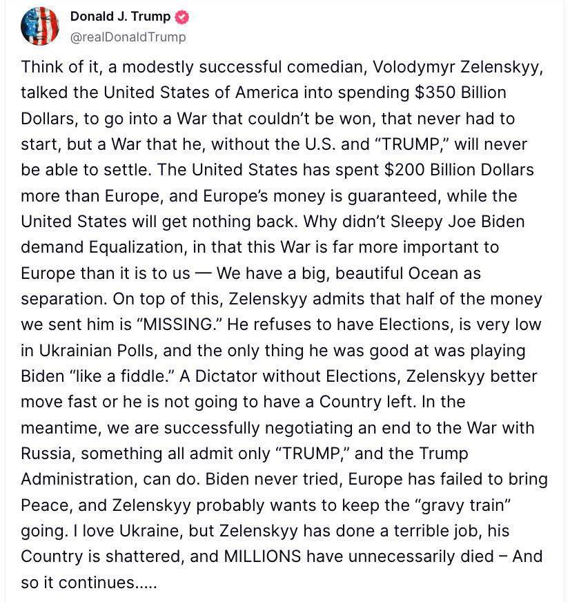 «Подумайте тільки: комік Володимир Зеленський, який мав скромний успіх, переконав Сполучені Штати Америки витратити 350 мільярдів доларів на війну, яку не можна було виграти, яка ніколи не повинна була початися, але яку він без США і Трампа ніколи не зможе врегулювати. США витратили на 200 мільярдів доларів більше, ніж Європа, причому європейські гроші гарантовані, а США не отримають нічого натомість. Чому ж сонний Джо Байден не вимагає вирівнювання, адже ця війна набагато важливіша для Європи, ніж для нас — у нас є великий, красивий океан, який нас відокремлює. Крім того, Зеленський визнає, що половина грошей, які ми йому відправили, «ЗНИПЛА». Він відмовляється проводити вибори, його рейтинги в українських опитуваннях дуже низькі, а єдине, в чому він досяг успіху — це «грати» на Байдені, як на скрипці. Диктатор без виборів Зеленському краще поквапитися, інакше в нього не залишиться країни. Тим часом ми успішно ведемо переговори про припинення війни з Росією — що, на думку всіх, може зробити лише Трамп та адміністрація Трампа. Байден навіть не намагався, Європа не змогла принести світ, а Зеленський, мабуть, хоче, щоб «фінансовий потік» продовжувався. Я люблю Україну, але Зеленський зробив жахливу роботу, його країна зруйнована, і мільйона загинули даремно - і це все продовжується...», - написав Трамп у своїй соцмережі.
