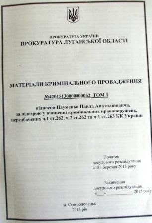 Подозреваемому инкриминируют присвоение личного табельного оружия, которое он законно получил и вывез из Краснодонского ГО УМВД в июне 2014 года в момент активной фазы АТО, после чего с этим оружием принимал активное участие в АТО.