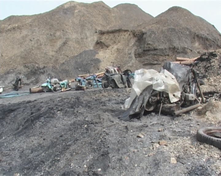 Как отмечено в сообщении, принцип работы этой «копанки» груб, дик и прост. Глубокий котлован, из которого ведут узкие норы в пласты залежей «чёрного золота», компрессор для нагнетания воздуха и переделанные мотоциклы вместо лебёдок.
