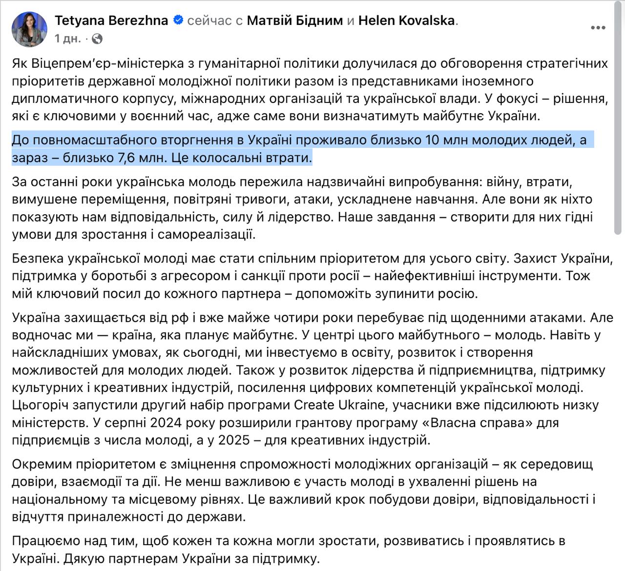 За роки повномасштабної війни в Україні стало на 2,4 млн молодих людей менше – було 10 млн, а стало 7,6 млн, повідомляє міністр культури Тетяна Бережна.