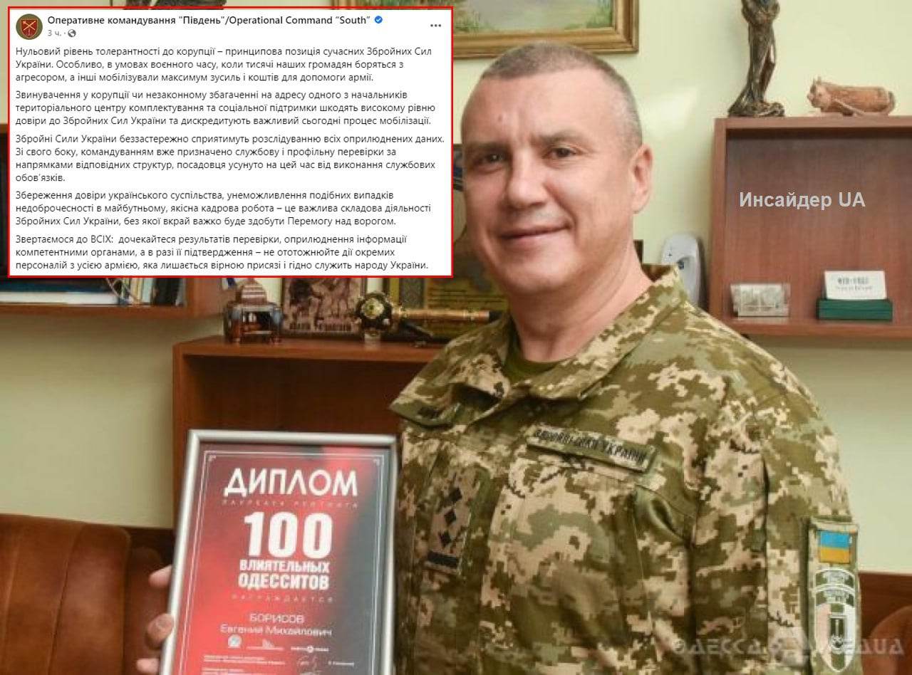 Одеського військкома Євгена Борисова, у якого знайшли дороге авто та елітну нерухомість, усунули від обов'язків та призначили перевірку, повідомляє оперативне командування «Південь».