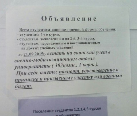 Все студенты дневной формы обучения «Далевского университета» должны до 21 сентября встать на воинский учет в военно-мобилизационном отделе. Об этом говорится в группе «Алчевск» Вконтакте.