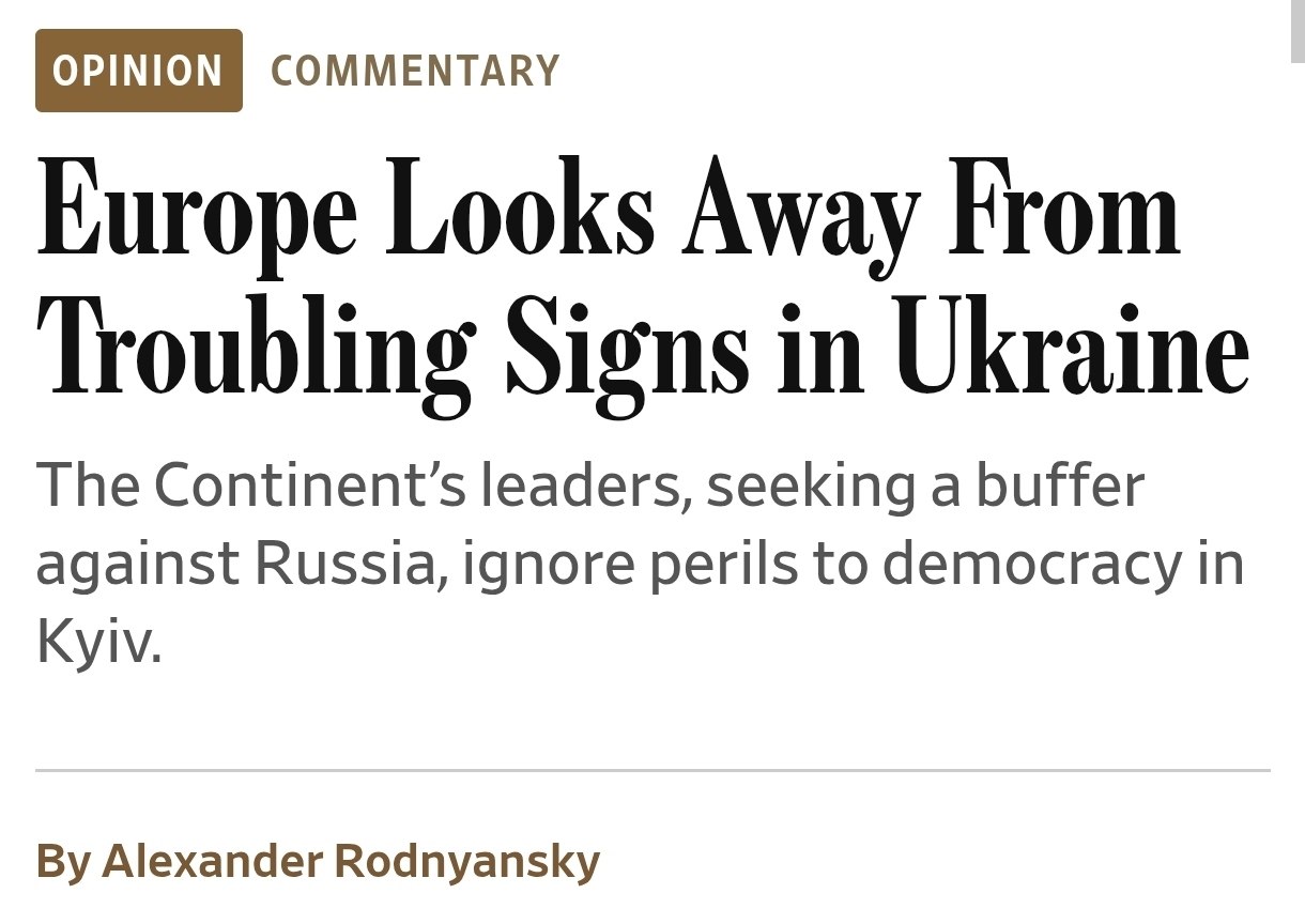 Європа заплющує очі на тривожні сигнали з України, пише в колонці для The Wall Street Journal колишній економічний радник Зеленського Олександр Роднянський (син відомого кінопродюсера Олександра Роднянського).