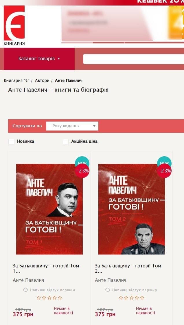 Найбільша в Україні мережа книгарень "Книгарня "Є" пустила у продаж мемуари хорватського фашиста Анте Павелича, союзника Гітлера, який проводив під час Другої світової війни етнічні чистки. Про це пише голова "Українського єврейського комітету" Едуард Долинський.