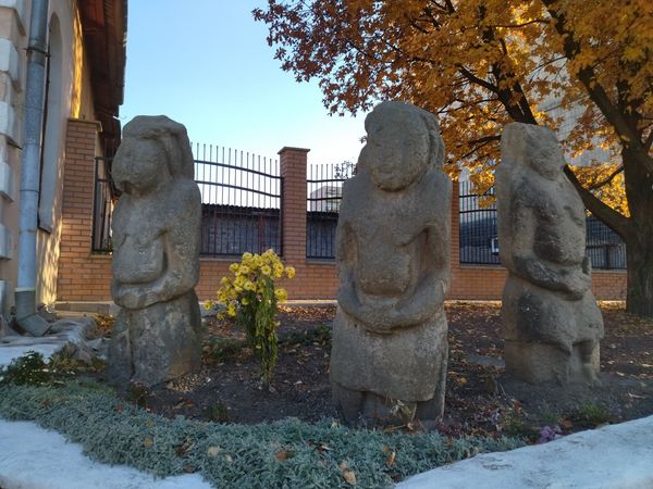Довідка: Полове́цькі ба́би — намогильні кам'яні статуї половців (кипчаків, куманів), пам'ятки сакрального мистецтва IX—XIII ст. До наших днів збереглося понад двох тисяч, розміщених переважно на території України та Південної Росії. Символізували предків і ставилися в спеціально споруджених для них святилищах. Їх зводили зазвичай на вершинах високих курганів або пагорбів. Це були звичайні квадратні або прямокутні загородки, споруджені з каменю. Розміри святилищ залежали, мабуть, від кількості шанованих в нім предків. Частіше за інших ставили дві статуї обличчями, оберненими на схід, — чоловіче і жіноче: родоначальників коша. Зрідка попадалися святилища з скупченням статуй — в кожному не менше 12-15. Біля підніжжя статуй знаходили кістки баранів.