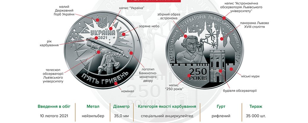 10 лютого 2021 року Національний банк України вводить у обіг пам'ятну монету номіналом 5 гривень. Вона присвячена до 250-річчя Львівської обсерваторії. Про це повідомили на офіційному сайті Національного банку.