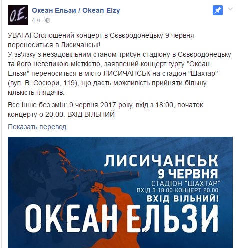 В связи с неудовлетворительным состоянием трибун стадиона в Северодонецке заявленный концерт группы группы «Океан Ельзи» переносится в город Лисичанск. Об этом ОЭ написал в Фейсбук.