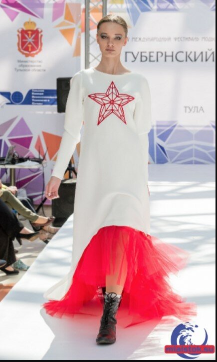 Платья щедро украшены изображением большой красной звезды, похожей на кремлевскую, красным бантом и вышитыми красными гвоздиками.