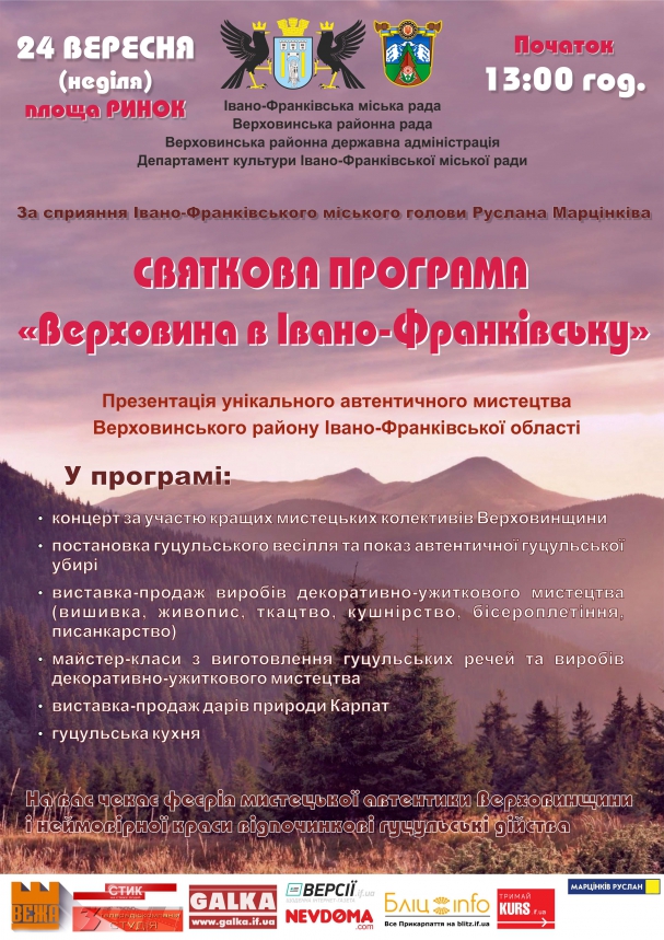 24 вересня, у неділю в обласному центрі проведуть святкову програму “Верховина в Івано-Франківську”, під час якої і мешканцям та гостям міста представлять зразки унікального автентичного мистецтва з гуцульського краю.
