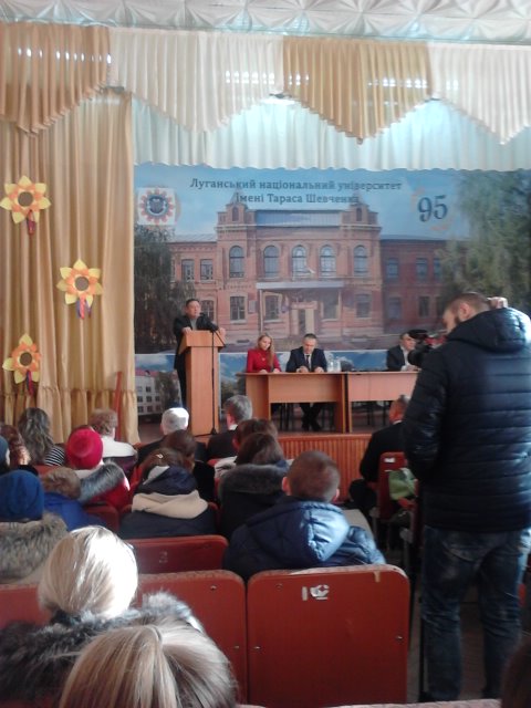 Ректор университета Сергей Савченко, открывая встречу, сказал, что университет действует в эвакуации в Старобельске с августа 2014 г. За это время произошла определенная адаптация к новым условиям. Сохранен профессорско-преподавательский состав, о чем свидетельствует то обстоятельство, что 70% докторов наук остались работать в своем ВУЗе. Поэтому, согласно последним рейтингам, ЛНУ имени Тараса Шевченко остается лидером среди эвакуированных университетов по показателю качества образования. В этом году студентами стали 3,5 тысячи молодых людей, что является хорошим показателем в нынешних условиях.