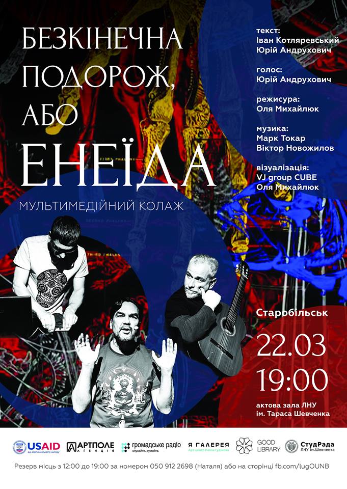 22 березня, о 19:00 в Актовій залі ЛНУ імені Т. Шевченка текст, музика та візуалізація стануть єдиним цілим, витворюючи мультимедійний колаж – «Безкінечну подорож, або Енеїду»: