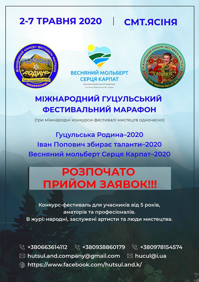 2-7 травня 2020 р. у Верховині (Івано-Франківська обл.) збирається Міжнародний гуцульський фестиваль марафон., повідомляють організатори.