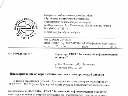 5 января о ситуации, которая сложилась не по вине техникума, и с просьбой не отключать от электроснабжения, учебное заведение отправило письма в ЛЭО и Лисичанский РЭС.