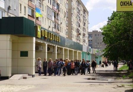 Проходя по проспекту Ленина в Лисичанске Луганской области мимо «Ощадбанка» каждый рабочий день наблюдается огромная очередь до 150 человек, преимущественно состоящая из переселенцев.
