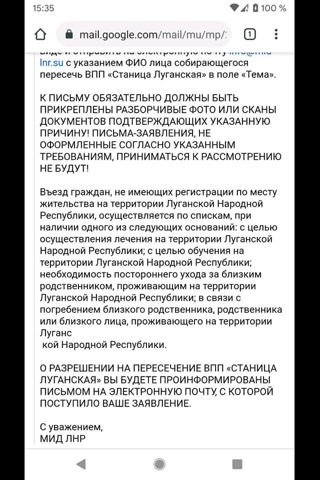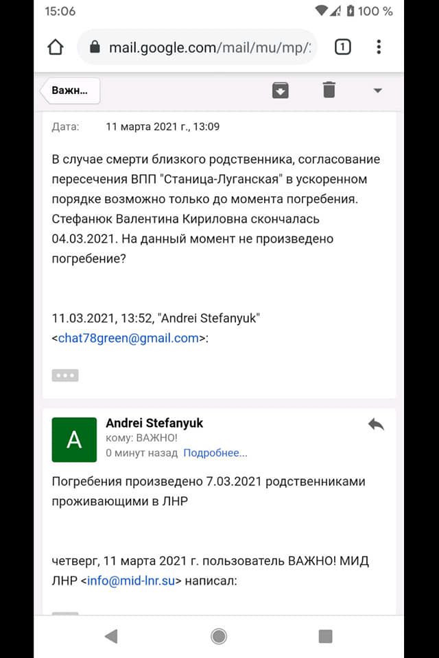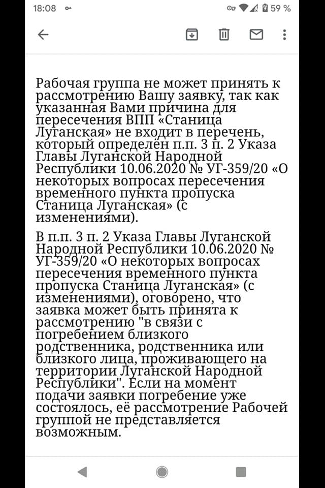 Син їхав щоб похоронити матір через всю Україну. Прожив на КПВВ три дні. За цей час добрі люди похоронили його матір, а сина так не пустили до матері навіть на могилку. Відповідь лнр була такою: якщо вашого родича ще не поховали, то пустимо, а якщо поховали, то вже ні. (Надані мені скріншоти із листуванням людини та чиновників окупаційної влади додаю).