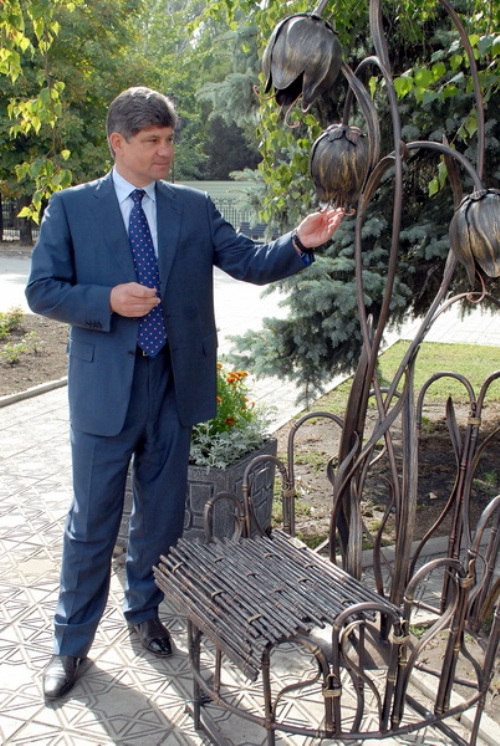Кроме того, луганский художник по металлу Олег Безуглов преподнес городу в подарок кованую композицию «Скамейка в цветах». Она установлена в центре города возле памятника Божьей матери.