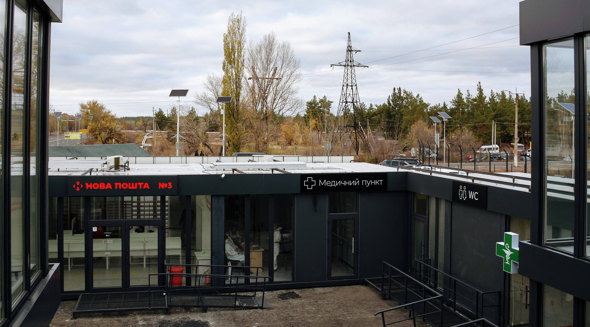 Глава держави проїхав на автобусі автомобільну частину КПВВ та оглянув сервісний центр, в якому також розташовані відділення «Ощадбанку», «Нової пошти», аптека, кімната матері та дитини.
