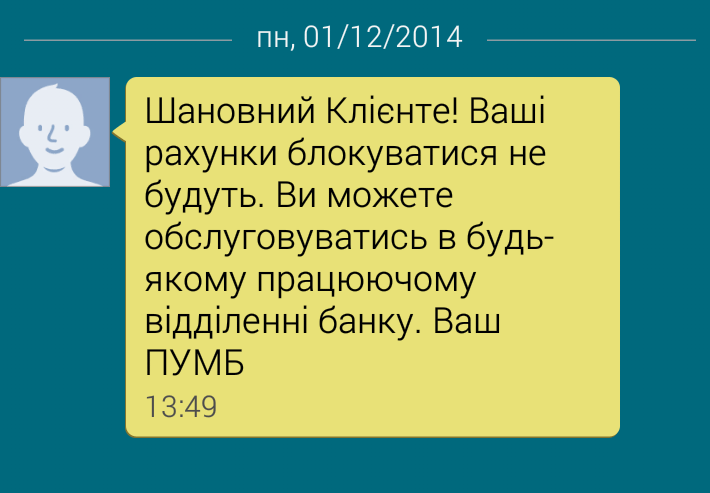 Так, клиентам банка ПУМБ, проживающим на Донбассе, поступает рассылка-смс, в которой говорится, что счета блокироваться не будут, и люди могут обращаться в любое работающее отделение.