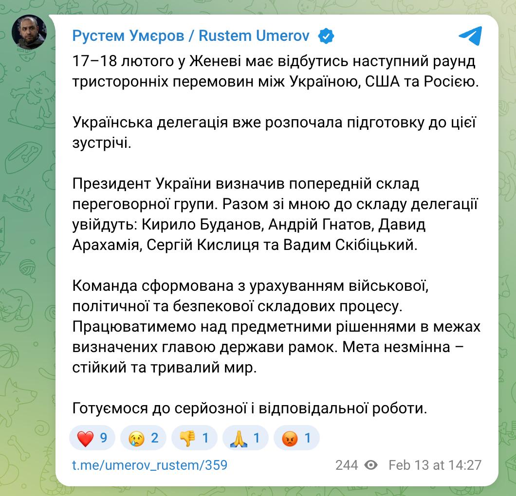 17-18 лютого у Женеві має відбутися наступний раунд переговорів - Умєров