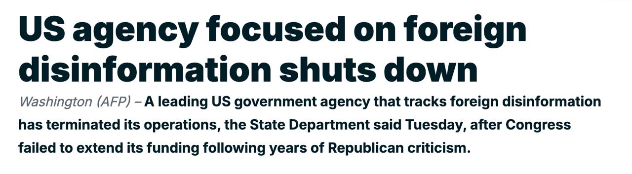 Український полiтолог Кость Бондаренко написав: "24 грудня у США закрився підрозділ боротьби з дезінформацією при Державному департаменті США - головний інструмент цензури в руках глобалістів. Саме 120 співробітників цього підрозділу займалися тим, що вирішували: новини, опубліковані у ЗМІ, і навіть пости у соціальних мережах – це правда чи брехня. Вони вирішували, у якій інтерпретації мають подаватися ті чи інші повідомлення. Від них залежало, блокувати чи не блокувати той чи інший контент. Підрозділ мав існувати до 2031 року, але Конгрес не виділив кошти (61 млн. доларів) на його функціонування на 2025 рік.Одним із головних прихильників закриття підрозділу був Ілон Маск.