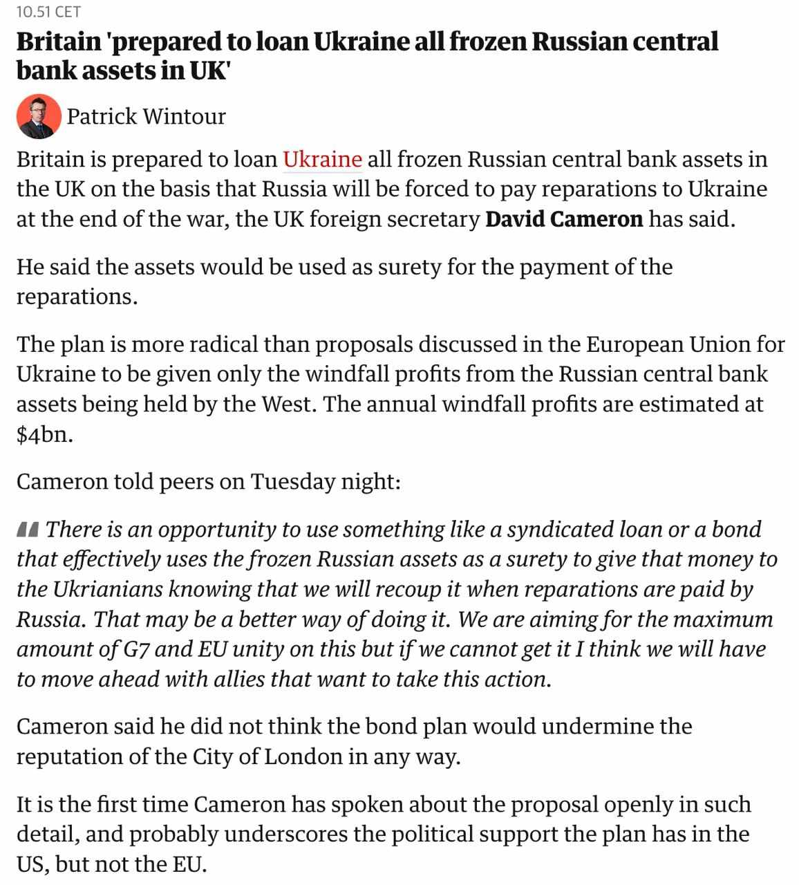 Британія готова надати Україні всі заморожені активи російського центрального банку на своїй території, наводить слова міністра закордонних справ Девіда Кемерона The Guardian.