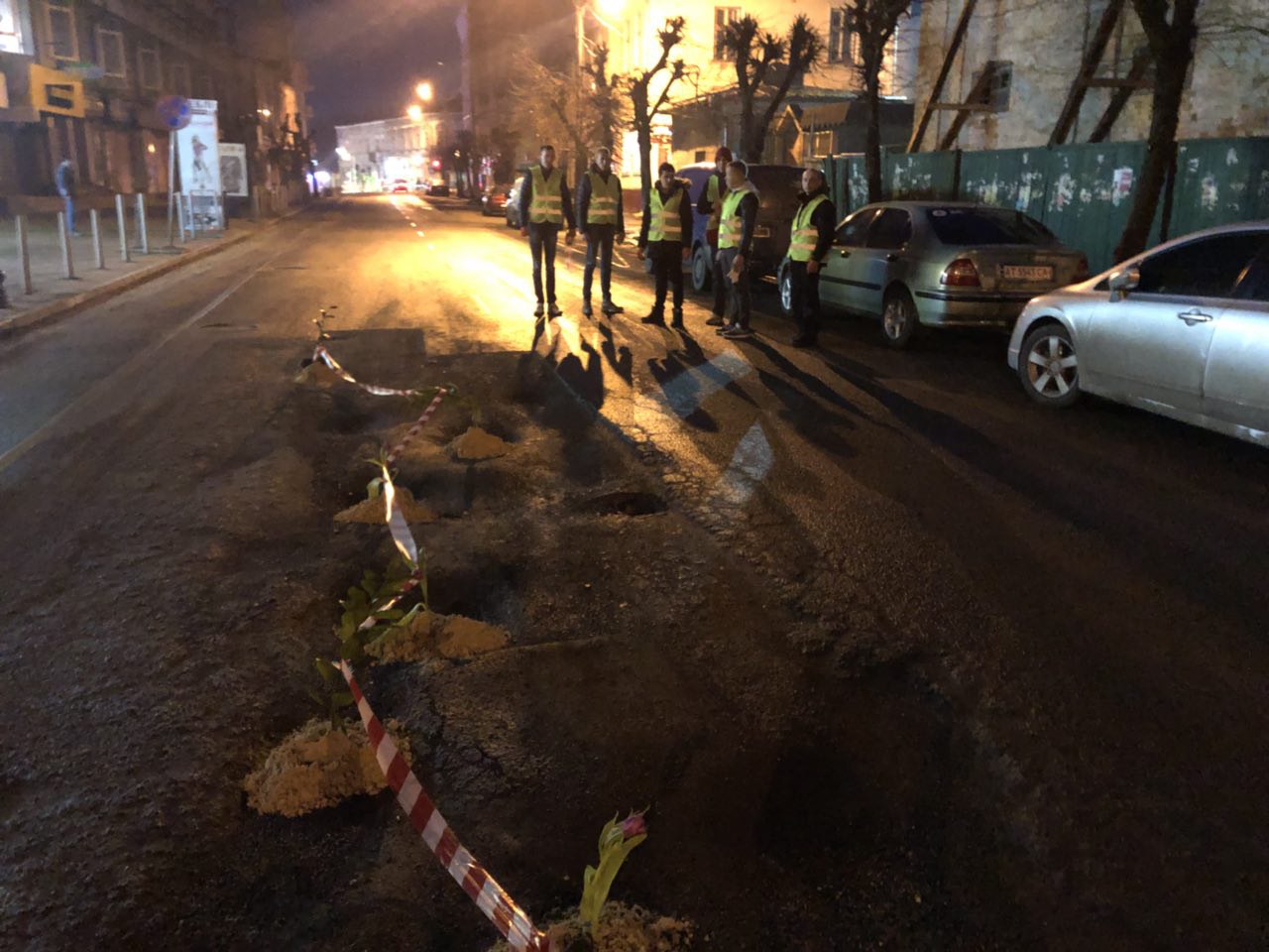 Автовласники закупилися тюльпанами та піском, і цієї ночі висадили їх у ямах на найбільш проблемних ділянках. Місця, де акціонували, обвели сигнальною стрічкою. У такий спосіб водії хочуть привернути увагу на поганий стан доріг після зими.