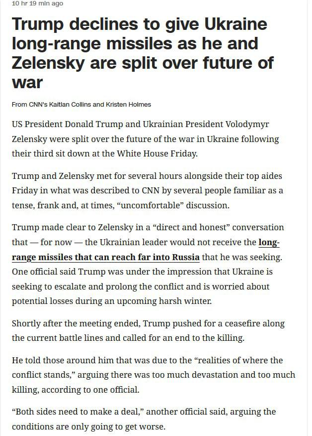"У прямій і чесній розмові Трамп ясно дав зрозуміти Зеленському, що поки український лідер не отримає ракети великої дальності, здатні долетіти до найдальших куточків Росії, які він просить. Один із чиновників заявив, що Трампа склалася враження, що Україна прагне ескалації і затягування конфлікту", - пише видання.