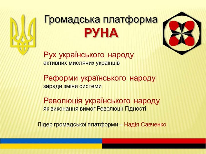 Надежда Савченко анонсировала собственную политсилу — «общественную платформу «РУНА» (аббревиатура от «Рух українського народу»).