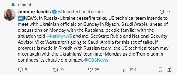 «На переговорах про припинення вогню між Росією та Україною технічна команда США має намір зустрітися з українськими офіційними особами в неділю в Ер-Ріяді, перед обговореннями у понеділок із росіянами, повідомили мені люди, знайомі із ситуацією. Державний секретар Рубіо та радник з національної безпеки Майк Уолтц не поїдуть до Саудівської Аравії на ці переговори. Якщо в Ер-Ріяді буде досягнуто прогресу з російською командою, технічна група США може знову зустрітися з українською командою пізніше у понеділок», – написала вона .
