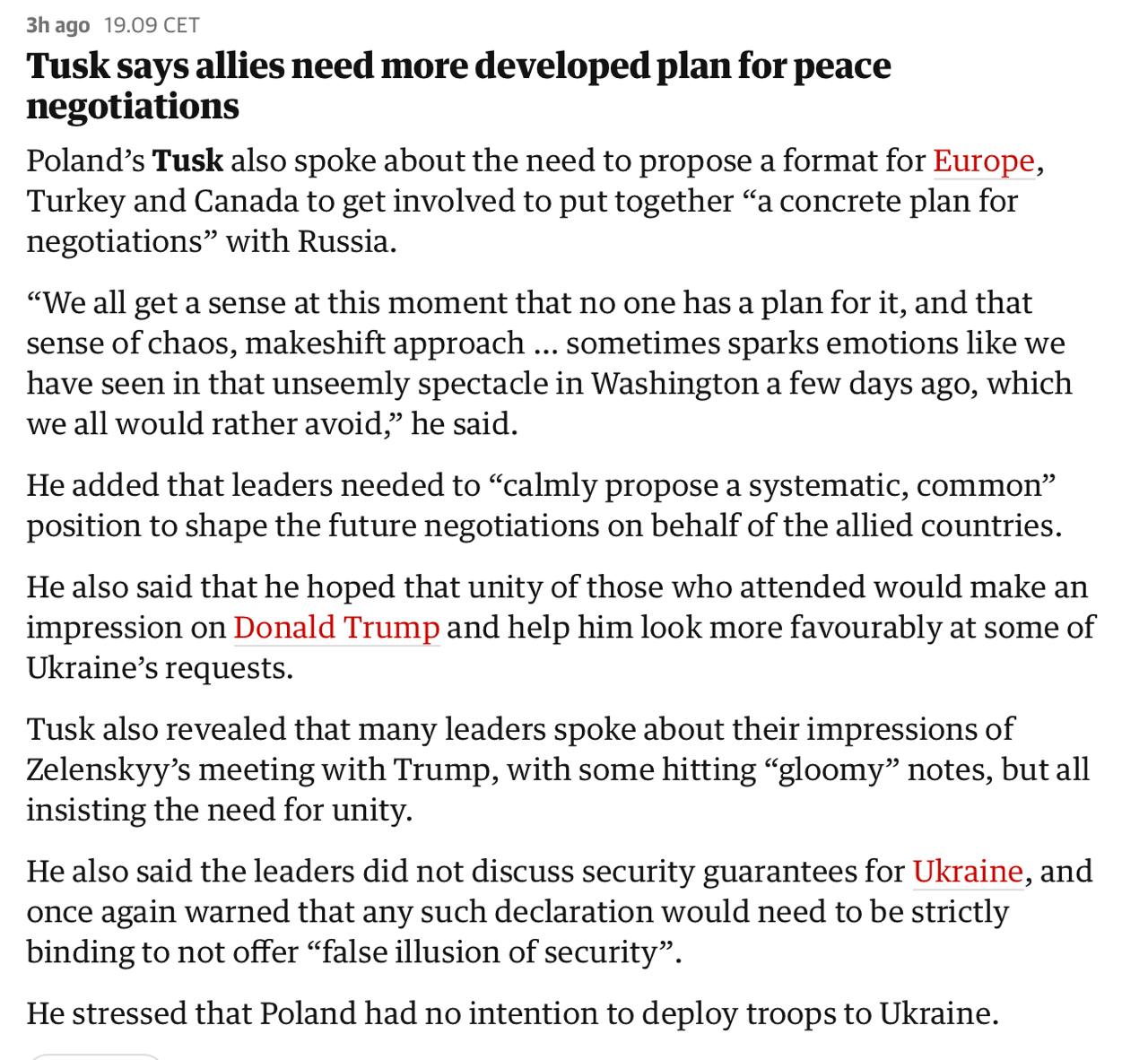Учасники саміту у Лондоні не обговорювали гарантії безпеки України. Про це заявив прем'єр-міністр Польщі Дональд Туск, передає TVN24.