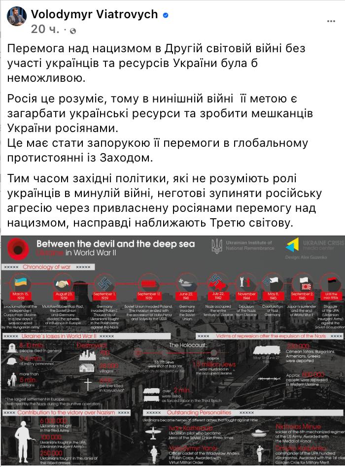 «Ведучий антифашист країни В'ятрович зауважив, що з нашою роллю у Перемозі над нацизмом щось не так. Інакше кажучи, її просто немає на офіційному міжнародному рівні. Більше ні. І обурився тим, що українців, героїв Великої Вітчизняної, записали до росіян.