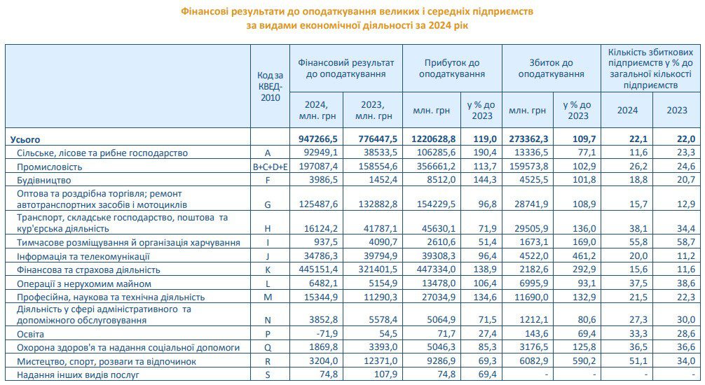 За попередніми даними, у 2024 році фінансовий результат до оподаткування великих та середніх підприємств становив 947,3 млрд грн прибутку (у 2023 році – 776,4 млрд грн), за даними Держстату.