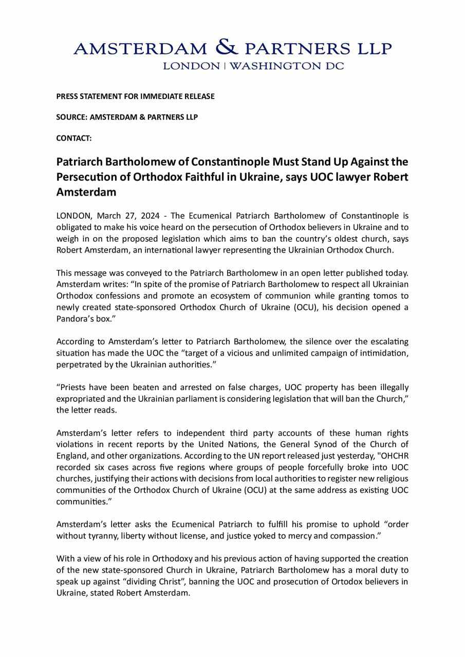 «З огляду на його роль у Православ'ї та його минулі дії щодо підтримки створення нової церкви ПЦУ в Україні, патріарх Варфоломій має моральний обов'язок закликати «не ділити Христа», виступити проти заборони УПЦ та переслідування православних віруючих в Україні», - заявив Роберт Амстердам.