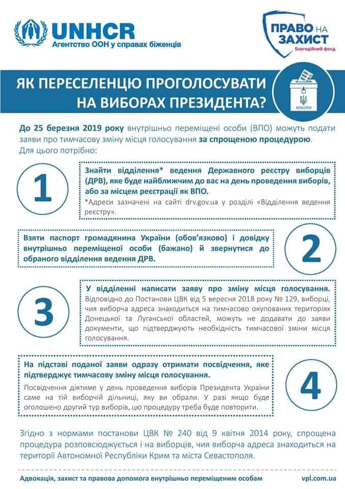 З 31 грудня 2018 року по 25 березня 2019 року внутрішньо переміщені особи можуть подавати заяви на тимчасову зміну місця голосування без зміни виборчої адреси за спрощеною процедурою - Право на захист