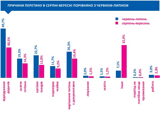 Те, кто хочет попасть на контролируемую территорию, основной причиной поездки называют решение проблем с документами и снятие наличности. На неконтролируемую — проверку своего имущества и возвращение домой. В обеих группах примерно одинаковое количество людей говорили, что посещают родственников.