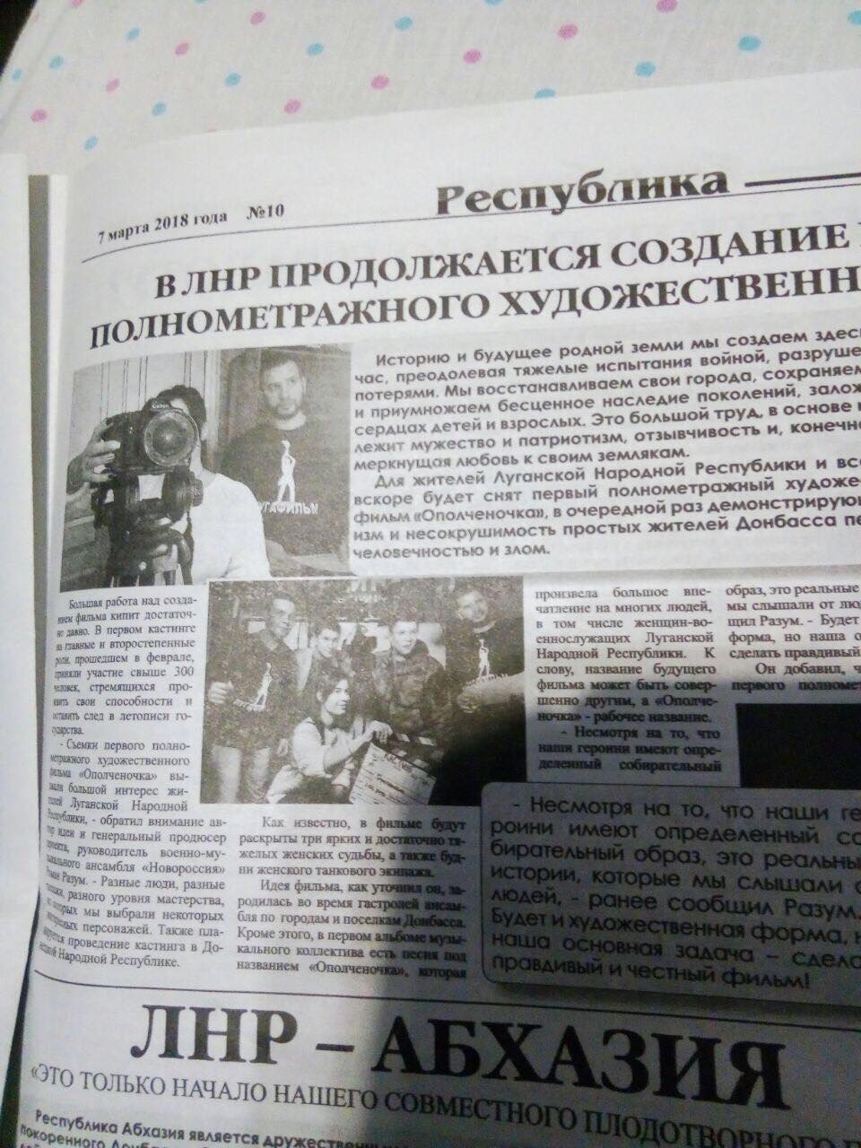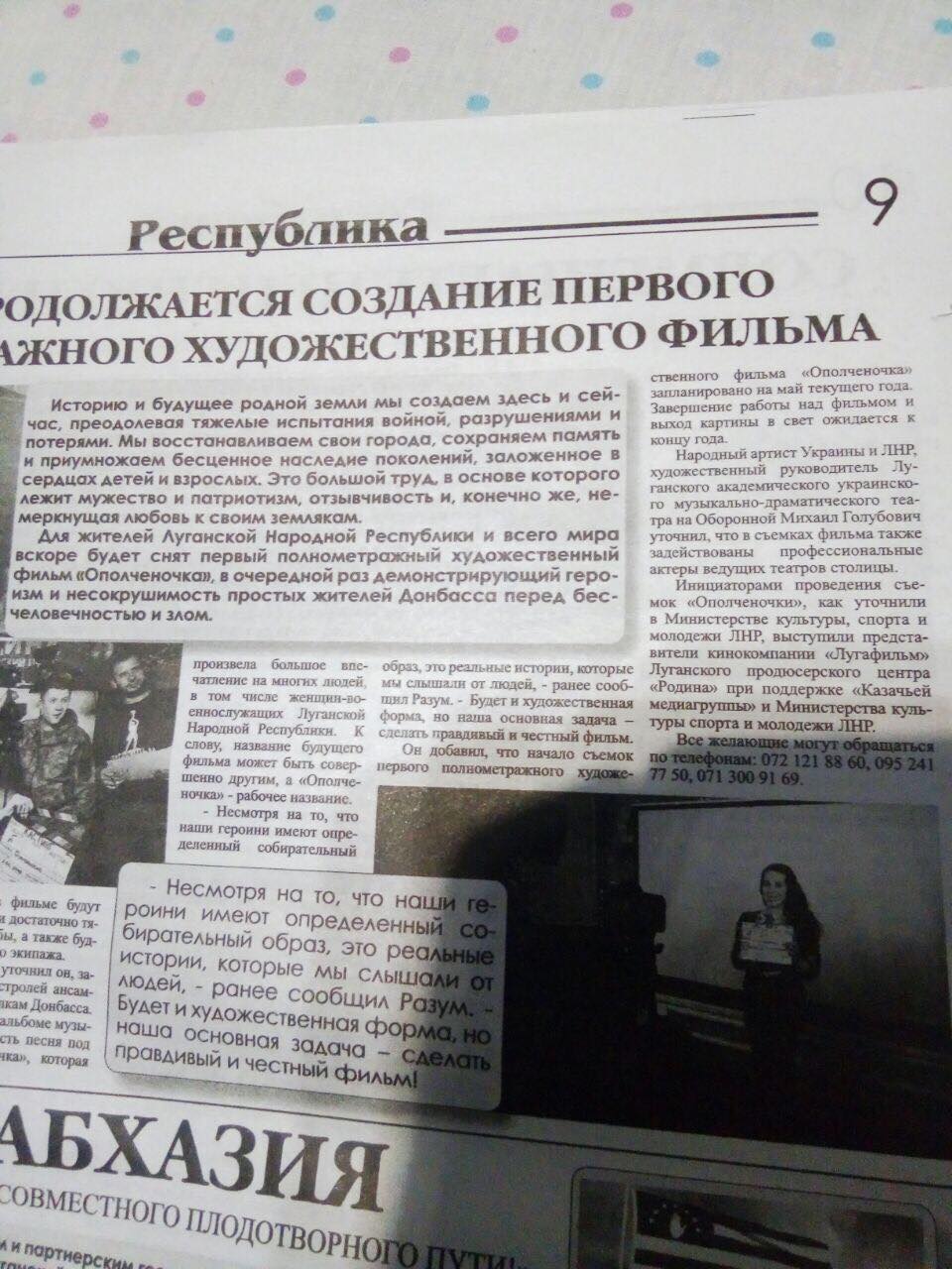 Наша редакция получила с оккупированной территории Лугаснкой области фотографию полосы газеты "Республика" (№18). В ней речь идет о том, что в "ЛНР" провели кастинг на участие в съемках художественного фильма с рабочим названием "Ополченочка".