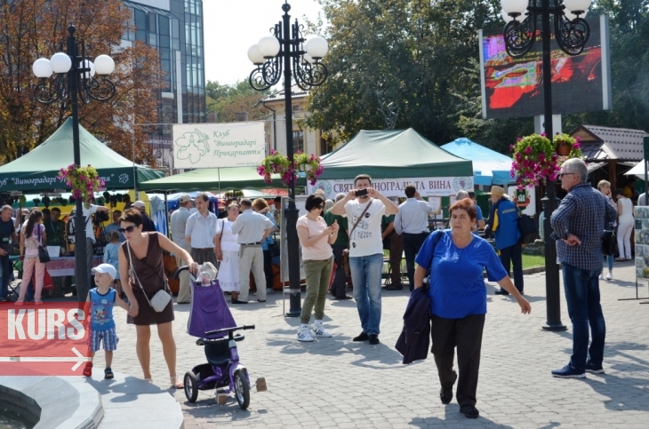 На дводенному виноградному фестивалі на площі Ринок в Івано-Франківську свою продукцію представляють 52 виробники винограду та вина з різних куточків України.