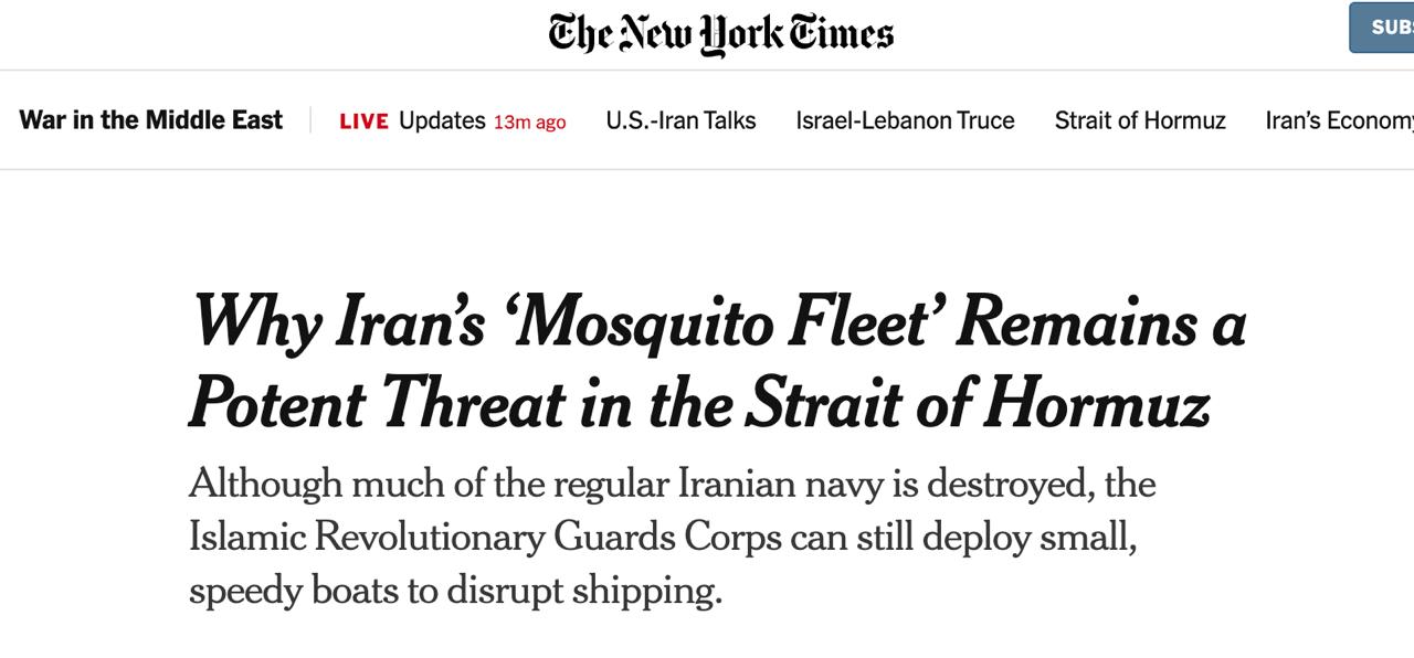 Армії СЩА не вдається знищити іранську "флотилію москітів", яка блокує Ормузьку протоку, пише The New York Times.
