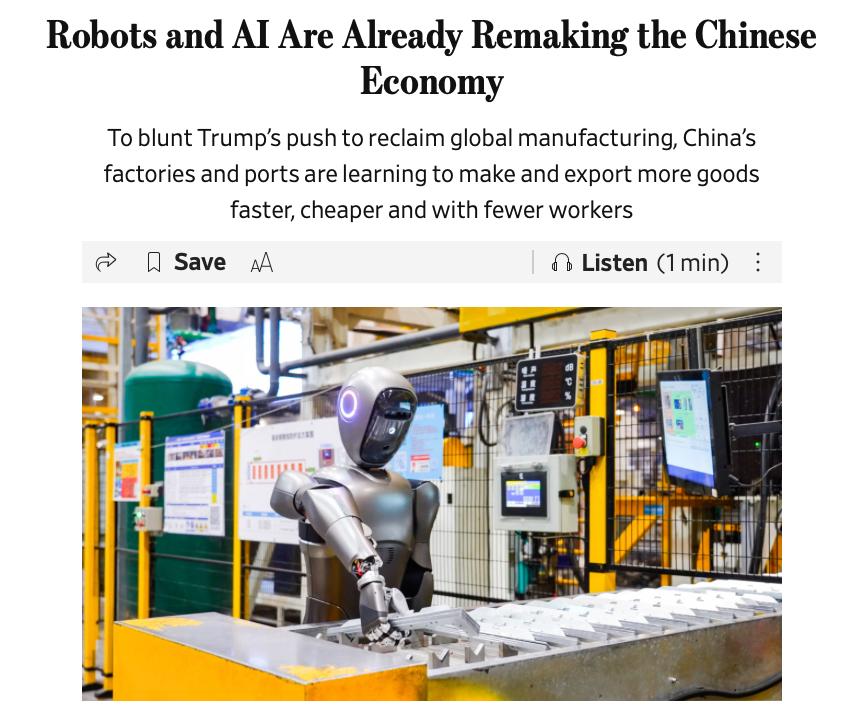 Wall Street Journal: Китай прискорено впроваджує штучний інтелект у виробництво та логістику, прагнучи закріпитися як світова фабрика на десятиліття вперед та надовго випередити США