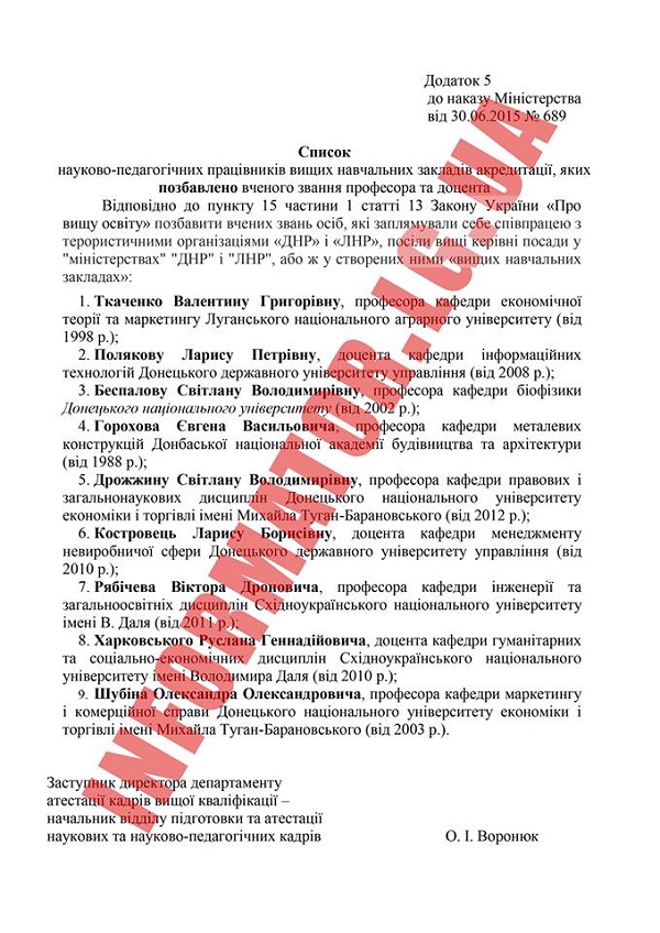 Министерство образования и науки Украины лишило научных званий профессоров и доцентов, а также других научных сотрудников, которые остались на оккупированных территориях и продолжили свою деятельность в «ЛНР/ДНР».