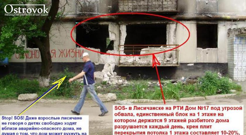 Так, в Лисичанске на кв. Октябрьской революции (в р-не з-да РТИ) пострадавший в результате боевых действий аварийно-опасный дом №17 может рухнуть в любую минуту.