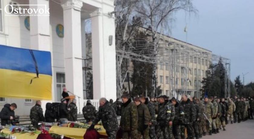 Траурный митин начался в 12.00. Возле Дворца культуры 9 красных гробов, накрытых государственными знаменвами. Постепенно горожане засыпают гробы букетами цветов. В стою с оружием в руках несут почетный караул представители украинских воинских частей, расквартированных в городе.