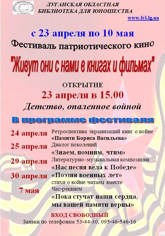 Фестиваль патриотического кино «Живут они с нами в фильмах и песнях» откроется в Луганске 23 апреля. Об этом сообщает пресс-служба Луганской областной библиотеки для юношества.