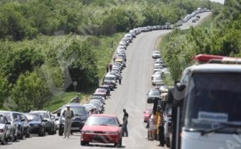 Спасает только Украина, в подконтрольные ей города массово ездят за дешевыми и качественными продуктами, лекарствами, за пенсиями, к банкоматам, на экзамены в университеты и по многим другим делам, которые в недореспубликах решить невозможно. На фото трасса со стороны Горловки, очередь у блокпоста. [13]