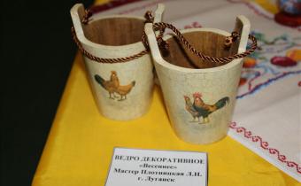 На выставке представлены лучшие работы народных мастеров и художников из городов и районов Луганской области на Пасхальную тематику, а именно: иконы, картины, полотенца, салфетки, скатерти, церкви из спичек, писанки, изделия из дерева и многое другое.
